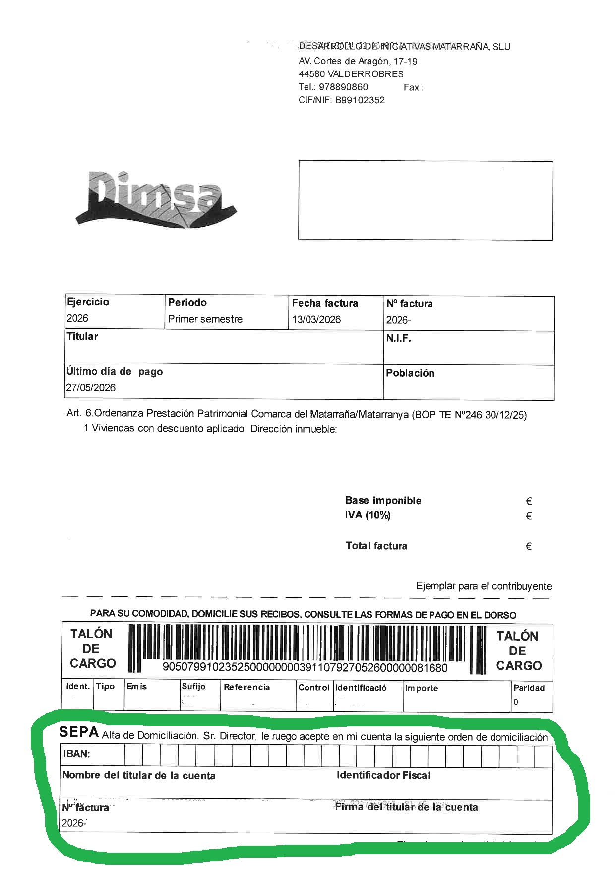 Se informa que en los próximos días se recibirá en los domicilios la primera factura del servicio de recogida de residuos. Esta factura corresponde al primer semestre del año 2026 y es emitida por la empresa pública comarcal Desarrollo de Iniciativas del Matarraña (DIMSA).
